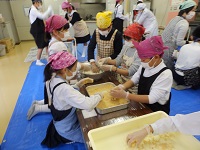 づくりをしました。5・6年生が田植え・稲刈りをした米を使い、4〜6年生で作りました。蒸したお米を6年生が突いてつぶし、5年生が丸めて、4年生がパック詰めをしました。縦割り班で仕事を分担し、協力して作業を進めた結果、なんと1時間で終了。美味しそうな「きな粉・あんこ・ごま」のおはぎがたくさんできました。