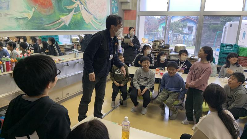 昼食の時間に、歌のプレゼントがありました。沢山のレパートリーを示してくれて、その中から子供達がリクエストした曲を、とっても素敵な声で歌ってくれました(県外在住のシンガーソングライターさんということです)。いつも楽しい昼食の時間がより楽しくなりました。3枚目の写真は、4年生が作成した防災ブックを避難所に届けたところです。子供達が一生けん命考えた内容が詰まっています。見てくれた方々にきっと思いが届くことでしょう。
