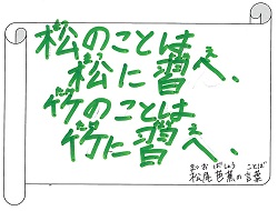 心を元気に④「松のことは松に習へ、竹のことは竹に習へ」 投稿日時 : 2018/02/15 システム管理者 【平成30年2月15日】今日の言葉は「松のことは松に習へ、竹のことは竹に習へ」。松尾芭蕉の言葉で、「そのものをしっかりよく見なさい」「観察しなさい」という意味です。素直な気持ちで物事をみて、感じる、といういい俳句をつくるコツだそうです。この言葉を選んだ保健委員さんは、勝手に思い込んではいけないということが分かってよかったと思い、この言葉を選んだそうです。参考: 齋藤 孝 著, 子どものための すごい!名言 世界がひろがる55の言葉, PHP研究所 Tweet {{options.likeCount}} {{options.likeCount}}
