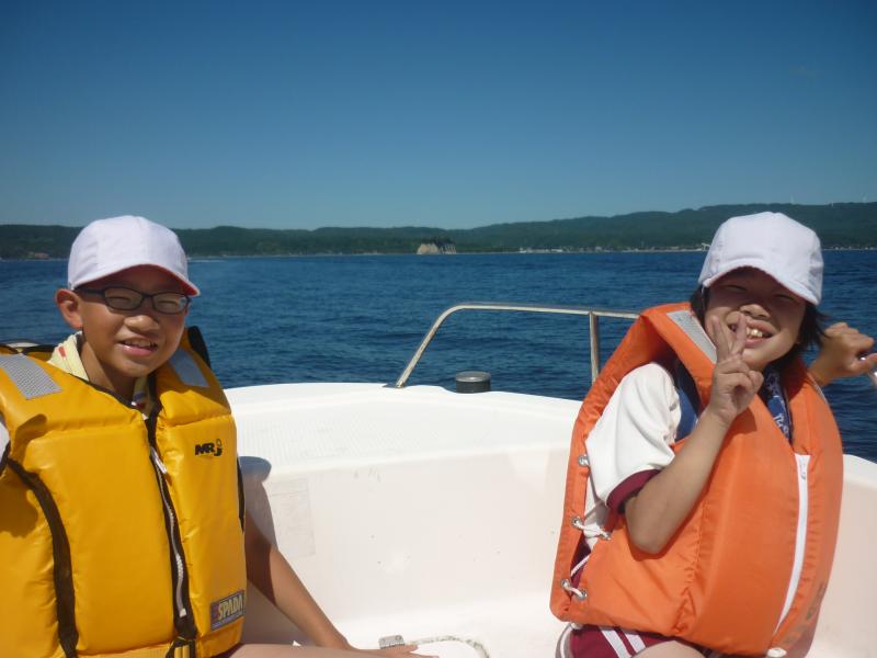 海から見たふるさとの緑の美しさ、水の美しさに感動したり、蛸島町の沖の水の色と宝立町の沖の水の色が違うこと、水の中の様子が違うことなど多くの発見をしました。また、海上保安庁の船からの放水も見学させてもらいました。子ども達は、船長さんに「海上保安庁ってどんな仕事をしているのですか?」と質問して、海の安全を守っていることを教えていただきました。