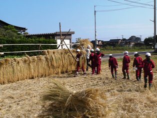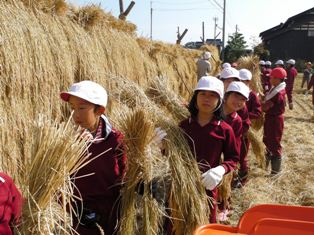 慣れないことなので鎌で手を切らないかと心配しましたが,誰もけがをすることなく無事に稲刈りができました。さすが経験のある6年生は刈るのがとても上手でしたね。でも刈るのは良かったのですが,その後の稲束をわらで縛ることにみんな苦労していました。縛った後は,稲束をはざにかけて干しました。