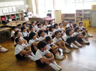 今日の全校朝会では,直っ子が一生懸命育てている野菜についてのお話でした。どの野菜も花を咲かせ,実をつけていることを児童は再確認しました。