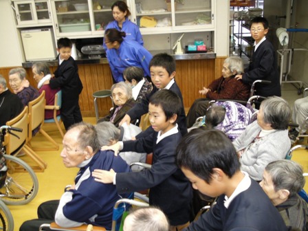 12月3日(水)に,5・6年生が長寿園を訪問しました。お年寄りのみなさんに合唱・合奏やなわとび・ダンスを見ていただいた後に,一人一人がお年寄りの肩もみをしながらお話をしました。かけ声や手拍子で盛り上げていただき,涙を流しておいでるお年寄りもいました。