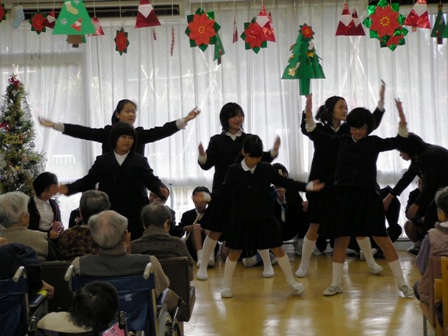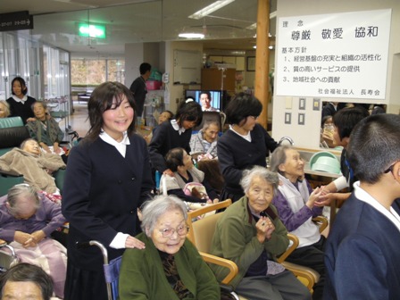 12月3日(水)に,5・6年生が長寿園を訪問しました。お年寄りのみなさんに合唱・合奏やなわとび・ダンスを見ていただいた後に,一人一人がお年寄りの肩もみをしながらお話をしました。かけ声や手拍子で盛り上げていただき,涙を流しておいでるお年寄りもいました。
