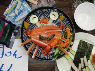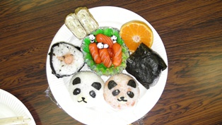 どの家庭も,アイディアいっぱいのおにぎりをにぎっていました。完成したおにぎりをきれいに盛りつけて,記念撮影をした後で,PTA三役さんと体験委員さんの作った豚汁でおいしくいただきました。