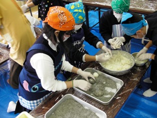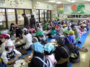 25家族86名が参加して,家族で仲良くおにぎりをにぎりました。お米は,学校田で育てたコシヒカリを使いました。はざ干しした新米をガス釜で炊きあげたほくほくのご飯です。