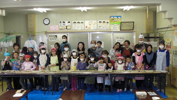 どの家庭も,家族仲良く巻き寿司を作っていました。完成した巻き寿司をきれいに盛りつけて,記念撮影をした後で,子どもたちだけで長い巻き寿司作りにチャレンジしました。4メートル62センチの長い巻き寿司が完成しました。