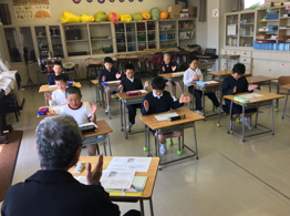野々江町の池谷内さんに、珠洲市の伝統民謡である田植え唄を教えていただきました。手拍子をしながら,池谷内さんが歌っているのを真似して,繰り返し練習しました。歌詞が少し難しかったですが,池谷内さんが丁寧に珠洲市の昔の言葉や方言を教えてくださいました。歌詞の意味がわかると覚えやすくなりました。