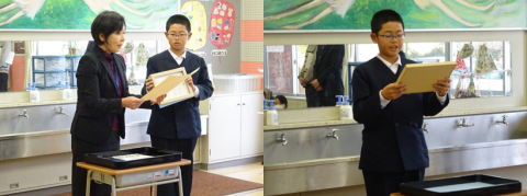 最後に、12月7日(土)に金沢で行われた「ざぶん賞」の表彰式に参加した5年坂尻さんが、いただいた賞を紹介してくれました。合わせて、書いた作文を全校のみんなに紹介してくれました。