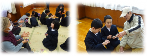 昔遊びが一通り終わると、先日の節分に合わせ、豆(お菓子)まきをしました。おじいちゃん・おばあちゃんがお菓子をまくと、歓声を上げながらお菓子を取りに走り回っていました。また、公民館の花餅をつかったおかきもいただき、思い出とお土産をたくさん持ち帰りました。