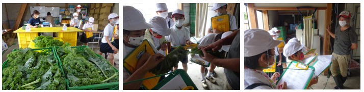3年生は社会科「畑で働く人々」の学習で、野々江地区で野菜を育てている「ベジュール」の作業場を見学しました。今の時期は、ケールなどを栽培・出荷していて、出荷する前の加工の様子を見学させていただきました。畑で働く人々の工夫や大変さをたくさん学びました。