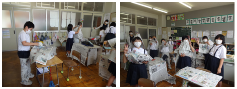 4年生は新聞紙を使って、様々なものを包んだ作品作りに取り組みました。ふだん使っている机やランドセルも新聞紙で包むと、四角い作品になりました。他にも、水筒や体操服、自分や友達の体を包んだりしていろいろな作品が仕上がりました。