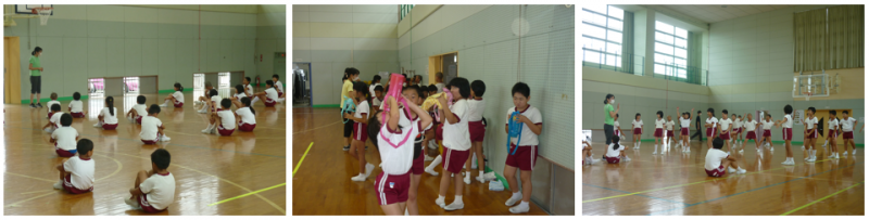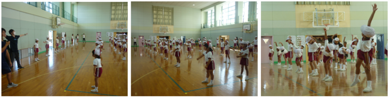 2限目に、全校児童が集まり、体育館でリズム運動練習を行いました。昨日は学年に分かれての練習でしたが、今日は全校児童で行いました。幸いにも天候は曇り、昨日のような暑さはありませんでしたが、途中で水分補給も忘れずに行いながらの練習となりました。初めての1年生も「楽しい!」とつぶやきながら練習に取り組んでいました。