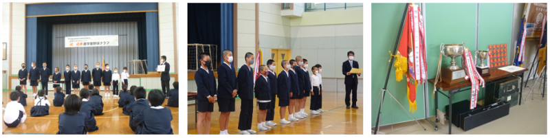 12日朝、急遽全校朝会を開き、直学童野球クラブの健闘を全校でたたえました。