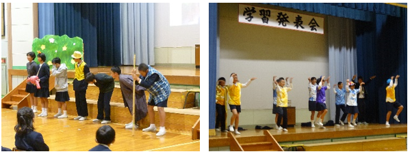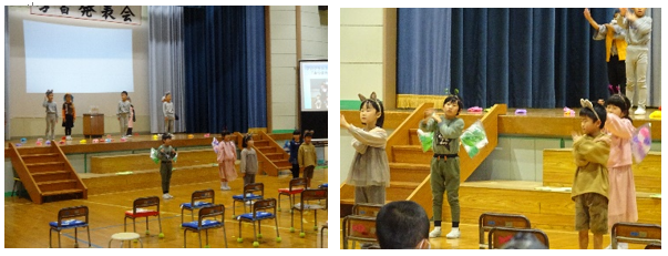 国語で学習したいろいろなお話を盛り込んだ劇にしました。上級生は1つ1つ懐かしさを感じながら観ることができました。初めての学習発表会でしたが、かわいい動きやはっきりした言い方で、元気いっぱい演じてくれました。