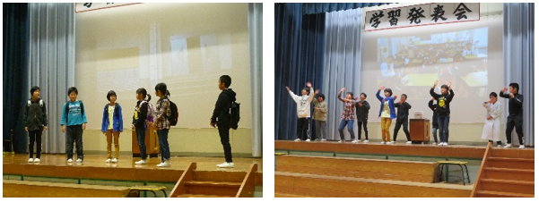 国語で学習したいろいろなお話を盛り込んだ劇にしました。上級生は1つ1つ懐かしさを感じながら観ることができました。初めての学習発表会でしたが、かわいい動きやはっきりした言い方で、元気いっぱい演じてくれました。
