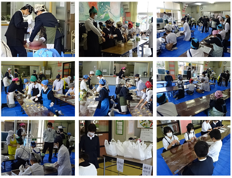 4~6年生は、調理師さんに蒸していただいたもち米を使って、きな粉・ごま・あんこの3種のおはぎを作りました。蒸したお米を半分つぶして、適度な大きさにまるめ、きな粉・ごま・あんこをつけます。最後にはパックづめして完成です。みんなでそれぞれの役割を分担して手際よく作り上げることができました。