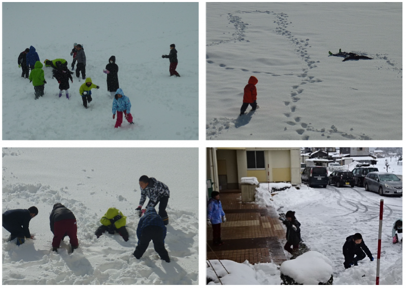 16日の昼休み、晴れ間がのぞいた天候の中、多くの子ども達は防寒着に長靴姿で、グラウンドに出て雪遊びをしていました。雪合戦、雪だるまづくり、それぞれが思い思いに雪の遊びに夢中になっていました。