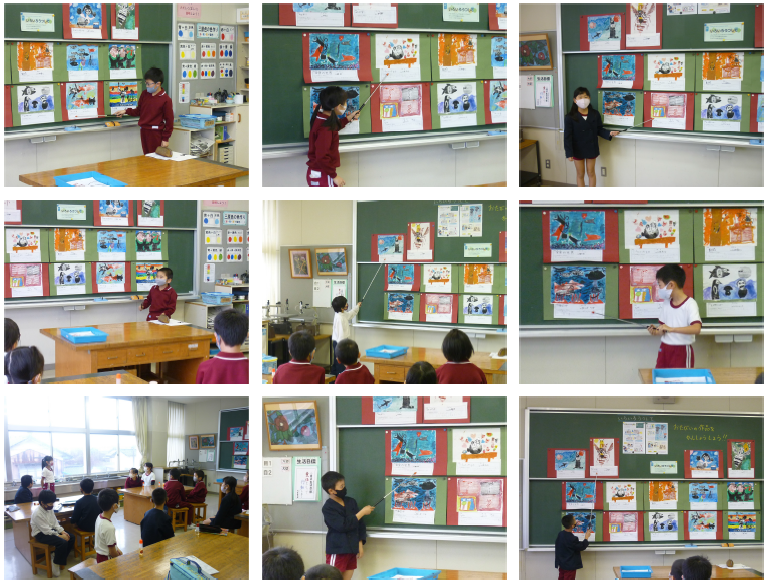 一人ひとりが前で自分の作品を紹介し、互いに感想を伝え合いました。みんなが相手に伝わるように話し、反応しながら聞く姿が見られ、素敵な鑑賞会になりました。