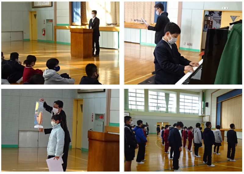 まず5年坂東さんの伴奏で、みんなで校歌を歌いました。この1年を振り返るかのように、心をこめた素敵な校歌を歌うことができました。校長先生からは、次のお話がありました。