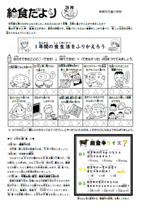 本日の給食は卒業お祝い献立/大納言小豆の日ということで、赤飯、牛乳、トンカツ、揚げ入り大根なます、すまし汁、お祝いデザートがでました。六年生は小学校最後の給食。その影響か「いただきます」「ごちそうさまでした」の声がいつもより大きくなっていました。大納言小豆を使用した赤飯はとてもおいしくおなかいっぱいいただけました。デザートも甘くて皆うれしそうにしていました。次の給食からは六年生と一緒に食べられないと思うと寂しいです。中学校に行っても元気にいっぱい食べて育ってください!