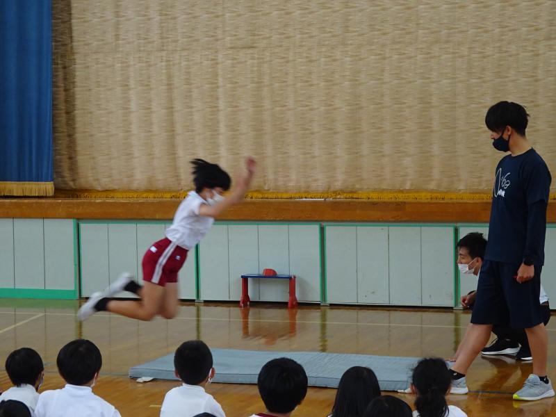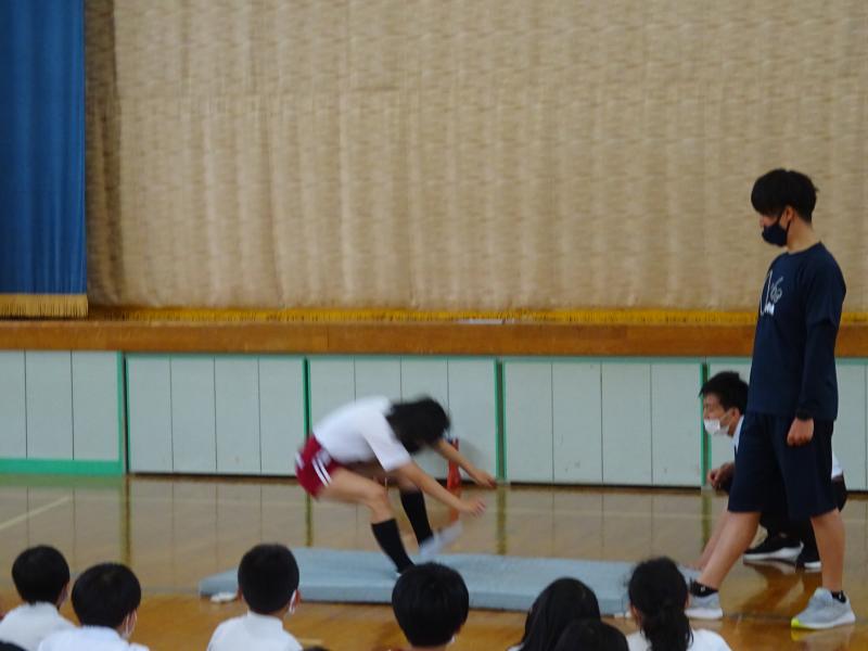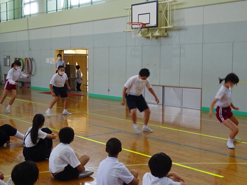 児童集会で、6年生がなわとびの技を紹介しました。今年度、全校で取り組む「体力アップ1校1プラン」のテーマは、「みんなで跳ぼう!直っ子ジャンピング!」です。立ち幅跳びの記録更新をめざしてなわとびに取り組みます。職員も一緒になわとびに取り組み、学校全体で跳躍に対する意識を高めていきます。