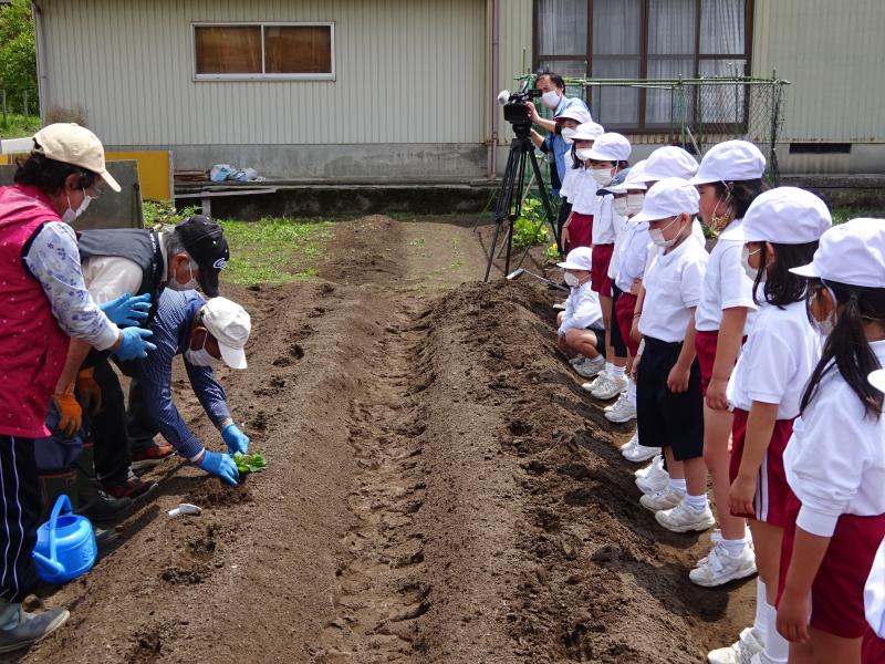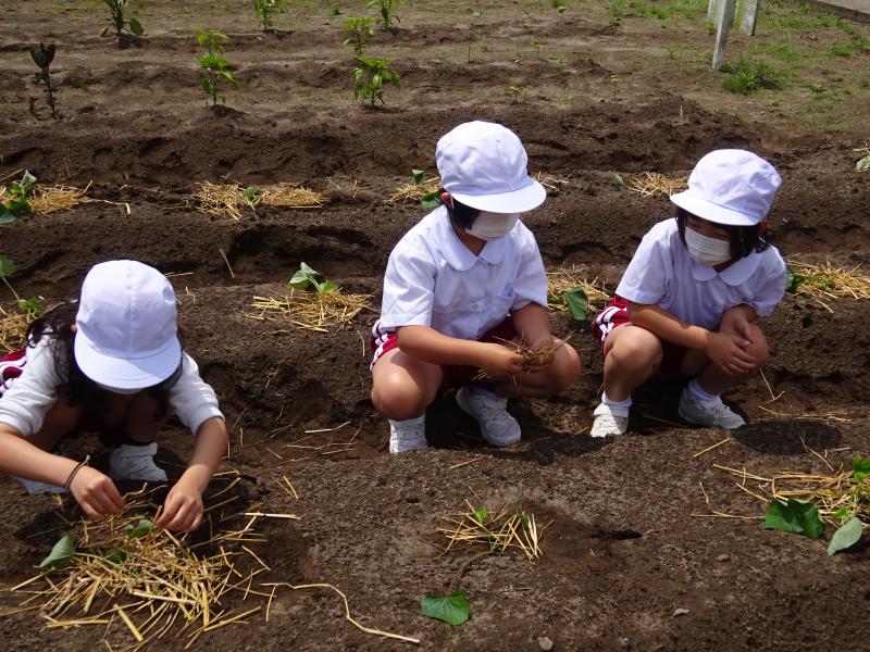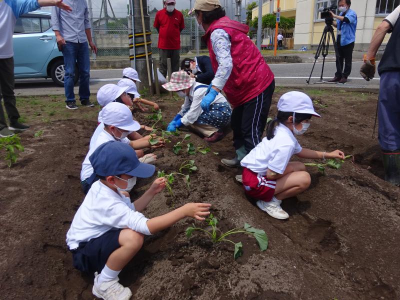 10日(金)の2限目に1年生がサツマイモの苗植えを行いました。直公民館さんの協力をいただいて、長生会の皆様に教えていただきながら、苗を植えていきました。(前もって畝づくりや除草もしていただきました。ありがとうございました。)7日に予定していたのですが、雨で延期になっていたので、子ども達はバケツの苗を見ながら今日を楽しみに待っていました。「お願いします」の挨拶の後、どうやって苗を植えるか説明を聞きました。いよいよ苗植えです。教えていただいた通りに、3畝にサツマイモ苗をやさしく丁寧に植えていきました。そして、じょうろで水を運んできて、苗にかけてあげました。さっそく来週から、水やり当番開始です。秋の収穫が楽しみですね。