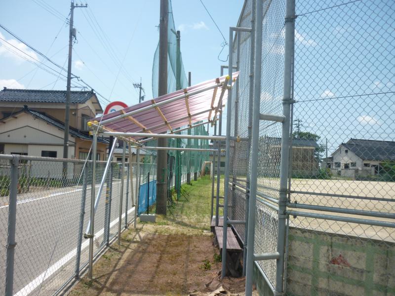 今まで、すずバスで通っている子ども達は、雨の日に傘をさしてバスを待っていました。梅雨の雨や冬の雪を考えて、バックネットの後ろに校務員さんが屋根を作ってくださいました。飯田小学と宝立小学校の校務員さんも手伝ってくださり立派な屋根ができました。これで、雨でも雪でも心配せずに待つことができます。