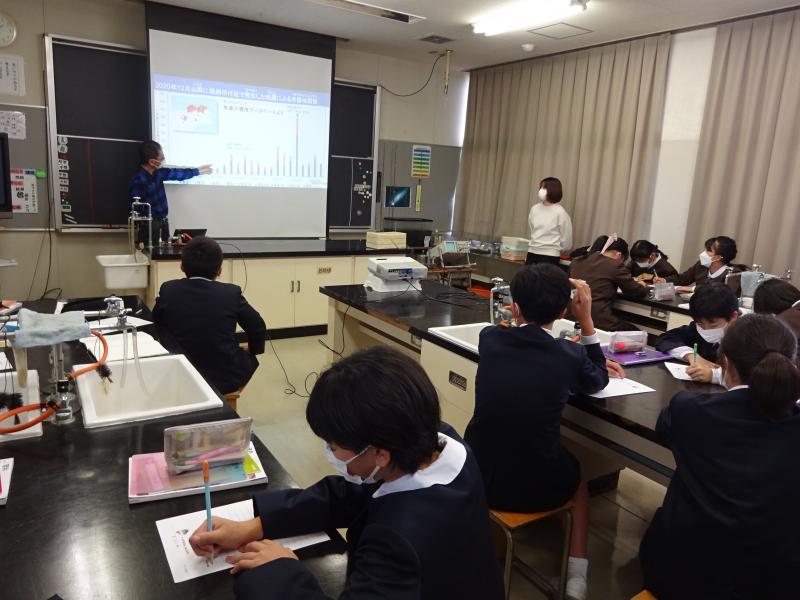 金沢大学の平松良浩教授にお越しいただき、6年生の理科で地震についてお話していただきました。地震計を理科室に設置し、近くで跳びはねたときの揺れと離れたところで跳びはねたときの地震計の反応で、地震の揺れの違いについて学習したり、珠洲市の地下の流体について説明してもらったりしました。平松教授は、小学生にも分かる平易な言葉で説明して下さり、地震について理解を深めることができました。ありがとうございました。