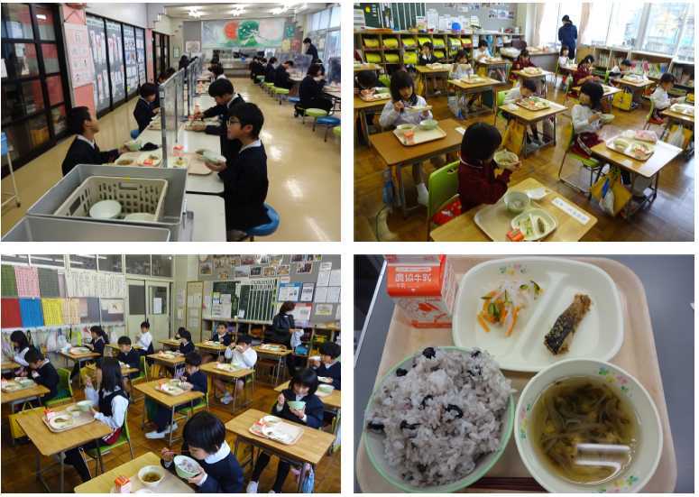 寒い日々がはじまりましたね。本日の給食は、あえのこと給食とのことで、献立は 黒豆ごはん 牛乳 魚の甘みそかけ 大根なます いわのりのすまし汁 でした。あえのことはユネスコ世界無形遺産「奥能登のあえのこと」です。1年教室では、モニターをつかってあえのことを勉強していました。黒豆ごはんはちょうど良い味でとても食べやすく、魚(ふくらぎ)はご飯に良く合い、大根なますはしゃっきしゃき、いわのりのすまし汁はいわのりの味がしっかりでていてとてもおいしかったです。おいしい給食で子どもたちの食べるスピードはとても早かったです。ごちそうさまでした。