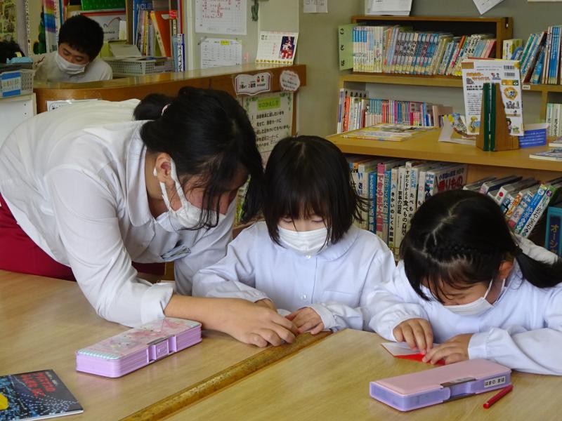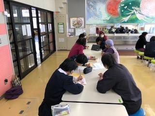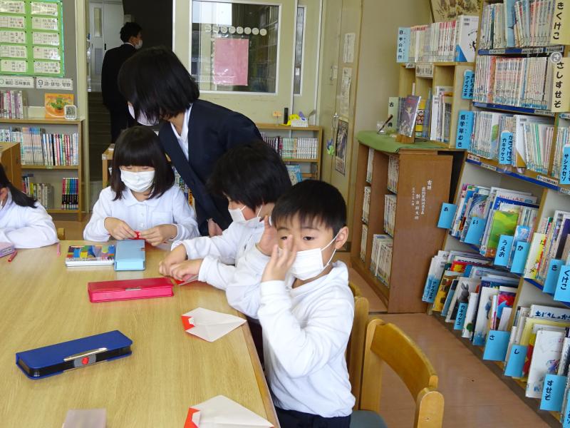 お昼休みに図書委員さんがクリスマスの読み聞かせをしてくれました。興味がある子ども達が集まってきて読み聞かせを楽しんでいました。その後、折り紙サンタを作りました。