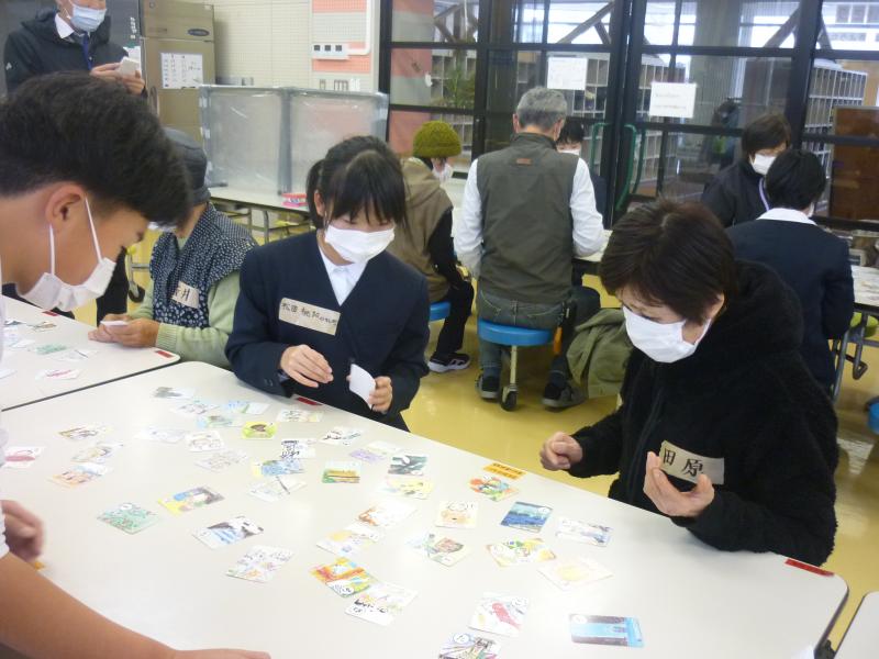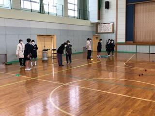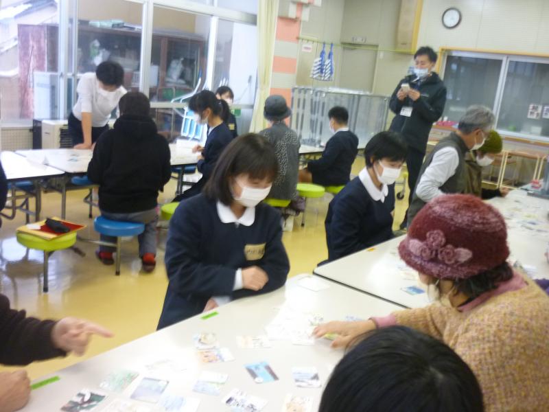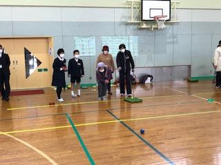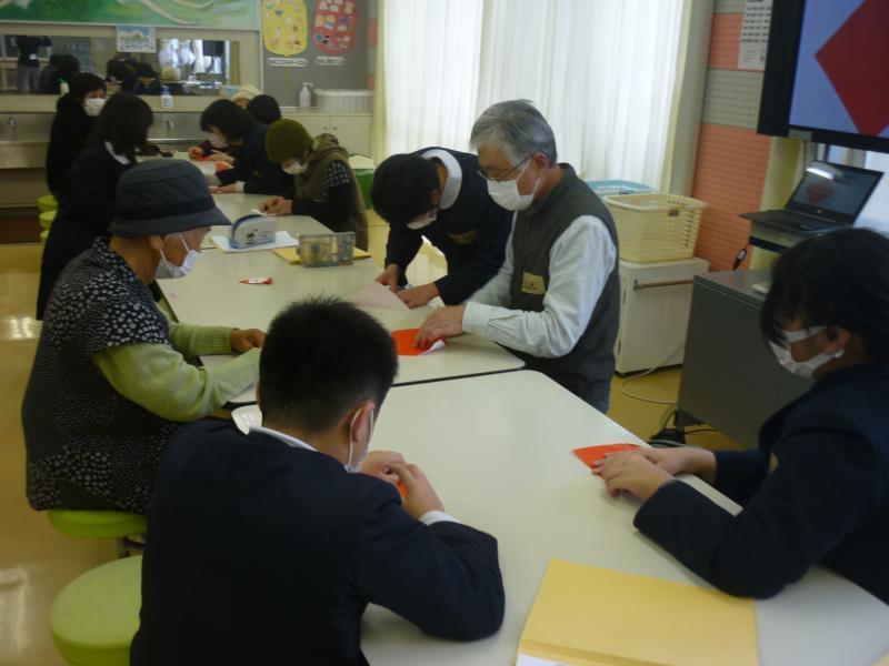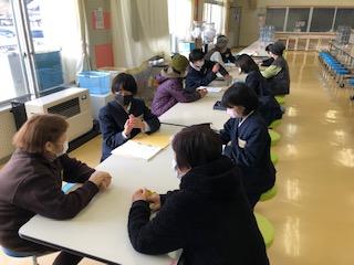 20日(火)の5・6限に6年生が地域の皆様と交流会を行いました。雪が降り、とても寒い中でしたが体育館でのペタンク大会からスタートしました。8グループに分かれ対戦しました。その後、なかよしルームに移動し、総合的な学習の時間に調べている内容についてインタビューしました。その後、サンタクロースの折り紙を作りました。顔チームと体チームに分かれて作りました。作った顔と体をつけたら出来上がりですが、これは後で仕上げて公民館にお届けします。出来上がりを楽しみにしていてください。公民館に飾られる予定です。最後は、珠洲かるたです。6グループに分かれて行いました。どのグループからも「はい!」と勢いよくかるたを取る声が聞こえてきました。寒い中、学校にお越しいただいた皆様、ありがとうございました。