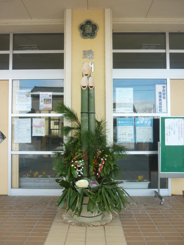 玄関に、直地区防犯委員会の皆様が立派な門松を飾ってくださいました。ありがとうございます。冬休みでも子どもたちは、体育館に遊びに来たり、図書室に本を借りに来たりと元気に過ごしています。玄関の門松を見て、「バランスがいい」「神秘的な感じがする」「お正月がきたって感じ」と感想を伝えてくれました。公民館の門松づくりに参加した児童は、使ってある竹や笹などすべてに意味があることを教えてくれました。公民館で教えていただいたそうです。