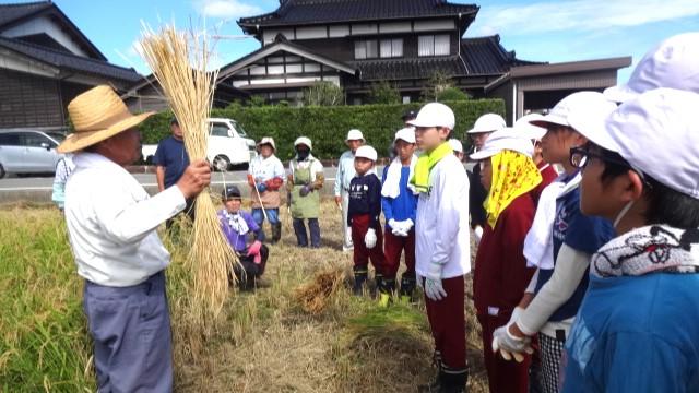 本日、天候にも恵まれ、たわわに実った学校田の稲刈り体験をすることができました。「農事組合法人 きずな」様のご指導、長生会、直公民館様のご協力の下、稲刈りの仕方、縛り方、はざかけを体験しました。下級生たちも応援にきてくれました。刈り取った稲を縛るのに、かなり苦労もしていましたが、どの作業も大変楽しかった」ようです。貴重な体験をさせていただき、お世話いただいた方々に心より感謝申し上げます。