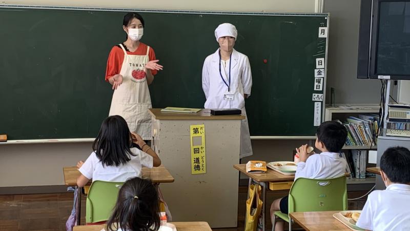本日、市内他校から栄養教諭の先生が来てくれました。配膳や給食の様子を見ていただきました。本校児童は実に食べっぷりがいいそうです。1年生には、クイズ形式で調理場のことも教えてもらいました。実際に使う大きなしゃもじも持たせてもらって、1年生は大喜びでした。食欲の秋を迎えます。これからもどんどん給食を食べてほしいです。