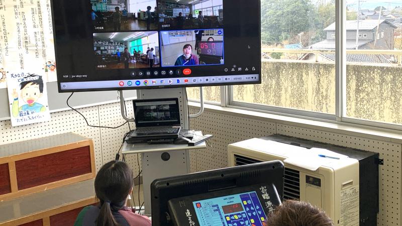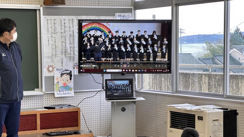 なわとび集会がありました。音楽室をメイン会場とし、その他に班の数に合わせ、3つの会場を設け、リモートでつなげ、互いの様子が見えるようにしました。準備運動も、音楽室から配信です。子供達は、それぞれの会場で、前跳び、二重跳び等にチャレンジ、これまでの練習の成果を思う存分発揮しました。どの会場でも応援の声が響き渡り、「絆」の太い、直っ子らしいなわとび集会でした。