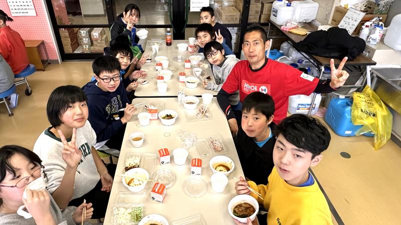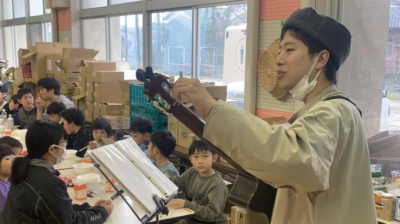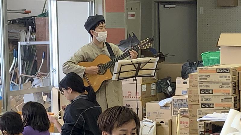 昼食の時間に、歌のプレゼントがありました。沢山のレパートリーを示してくれて、その中から子供達がリクエストした曲を、とっても素敵な声で歌ってくれました(県外在住のシンガーソングライターさんということです)。いつも楽しい昼食の時間がより楽しくなりました。3枚目の写真は、4年生が作成した防災ブックを避難所に届けたところです。子供達が一生けん命考えた内容が詰まっています。見てくれた方々にきっと思いが届くことでしょう。