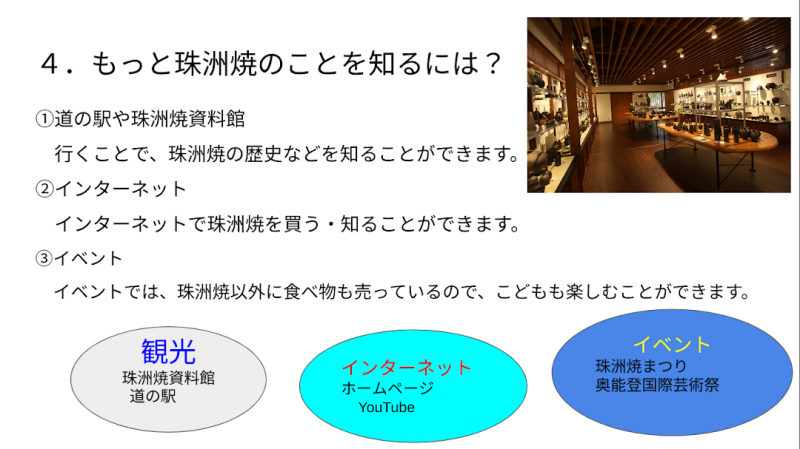 4年生が総合的な学習の時間に珠洲焼のことを調べました。調べる内に、珠洲焼にどんどん魅せられていったようで、珠洲焼のことを発信できるスライドまで完成させました。スライドの1枚1枚から子供達の思いが伝わってきます。珠洲市を明るく元気にしたいと思う子供達の心。嬉しく、頼もしい限りです。