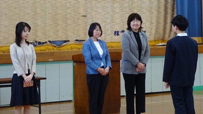 本日、交通安全見守り隊の方々との対面式、そして、珠洲警察署の方を招いての交通安全教室がありました。対面式では、見守り隊の方々が、日頃、どういう思いで見守っているかを話して下さいました。交通安全教室では「安全な歩き方」「安全な自転車の乗り方」「不審者対応」についてお話いただきました。交通安全協会様から、反射材シールもいただきました。安全への意識が一層高まった日となりました。