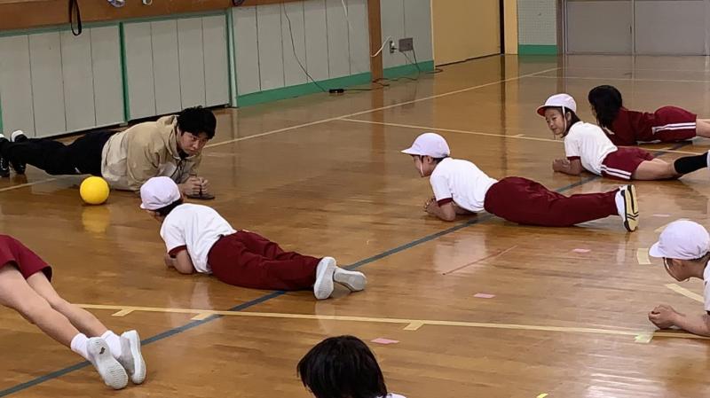 2年生の体育です。筋力をつけ、且つ、体のバランス感覚を上げる運動をしていました。その後、ダッシュ力、走力を上げるため、鬼ごっこもやっていました。小さい内に、色んな運動をすることは、後の成長にとても大切なことです。これからも、どんどん体を動かしてほしいと思います。