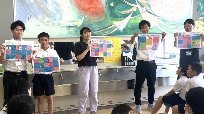 本校に元世界ボクシングチャンピオンの花形様が来校され、これまでの人生経験で得たことを話していただくとともに、希望者にボクシングのミット打ちをさせてくれました。「あきらめないことが大事」等、子供達の心に響いたことが沢山あったようです。ミット打ちは勿論全員が初めてでしたが、体験を楽しんだようです。パンチを人に向けて放つことの危険性もしっかり教えていただきました。チャンピオンベルトも持たせてくれました。ズシリと重かったようです。また、給食はオリンピック給食2日目、本日はイギリスでした。ミートパイをはじめ、今日もとても美味しかったです。