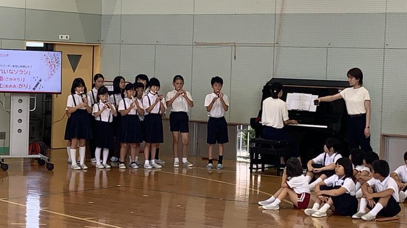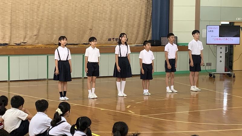 児童集会で、6年生が歌の発表をしました。曲名は「上を向いて歩こう」。オープニングは3年生のリコーダー。今の本校にピッタリです。素敵な歌声を聞いた後は、全校で、そしてご来校いただいた地域の方もまじえて合唱しました。普段から練習の歌声も聞こえているそうです。「歌は力」。これからもこういう発表を続けていきたいです。そして今日から給食はオリンピックにちなんだものとなりました。本日は「フランス」。開催国です。メニューはフランスにちなんだもの。とても美味しかったです。