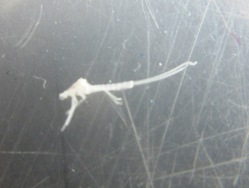 デジカメでマクロ撮影して見てみると,やはり,小さなトンボ系統のヤゴの抜け殻のような気がします。詳しいことは分かりませんが,あとで,私の師匠に聞いてみますね。