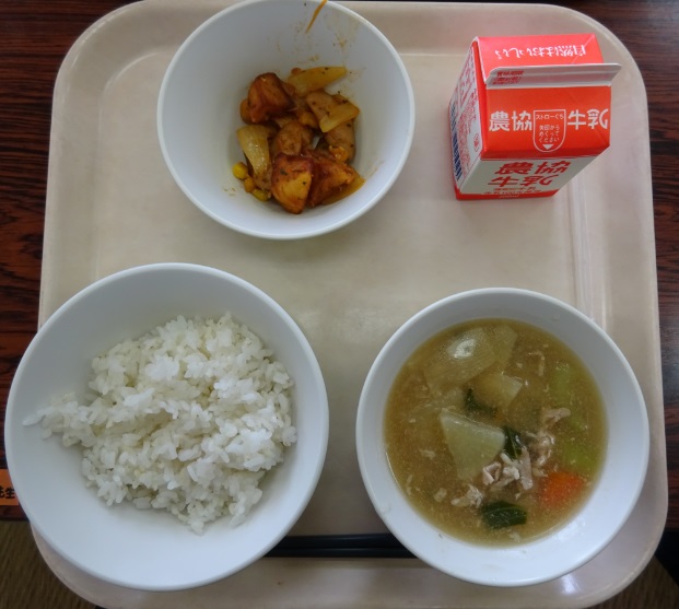たけのこごはん、いかと大根の含め煮、かきたま汁、牛乳