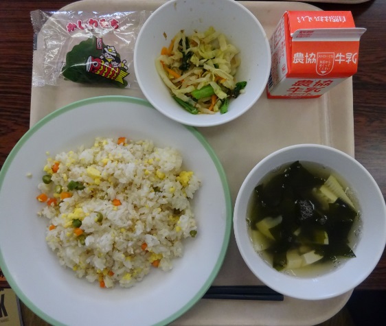 キムタクごはん、中華和え、干ししいたけのスープ、