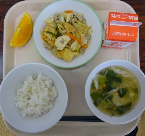 麦ごはん、豚肉と厚揚げのみそ炒め、