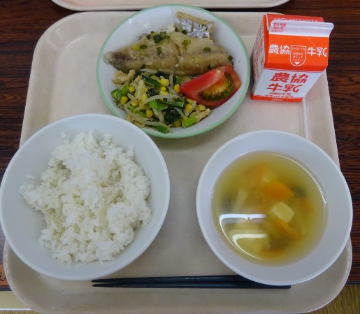 麦ごはん、魚のあげびたし、小松菜とコーンの和えもの、