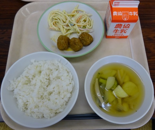 麦ごはん、星のコロッケ、野菜と錦糸卵の和えもの、