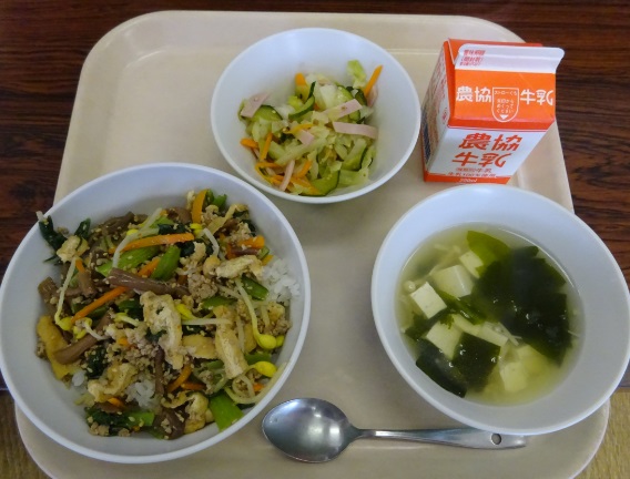 ビビンバ、中華サラダ、わかめスープ、牛乳