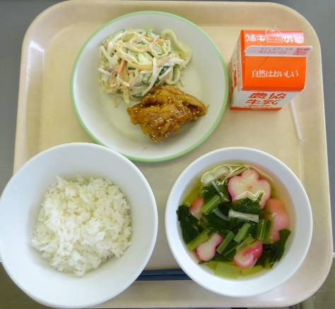 麦ごはん、鶏肉のごまからめ、いかくんサラダ、
